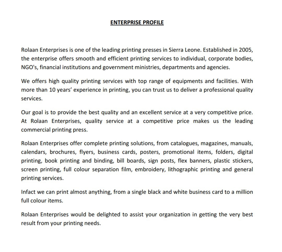 We are the leading service provider in Sierra Leone in the area of Offset lithographic printing, digital printing, digital Embroidery, Screen printing, large format printing, 3D PRINTING Service and flexographic printing